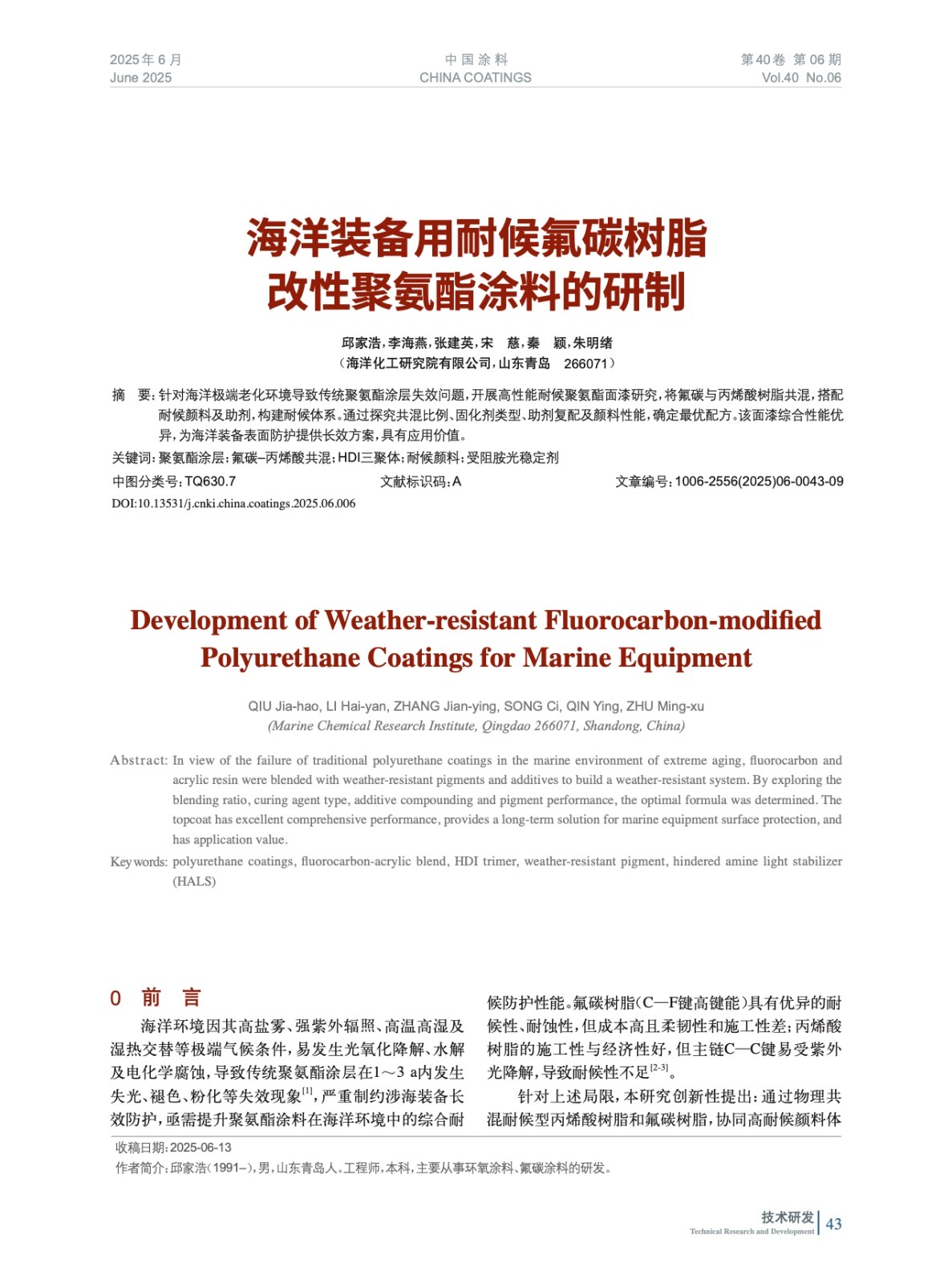 本文系作者@邱家浩,李海燕,張建英,宋 慈,秦 穎,朱明緒 授權中國涂料網發表,并經中國涂料網編輯,未經允許不得轉載,如需轉載請聯系chinacoatingnet@vip.163.com