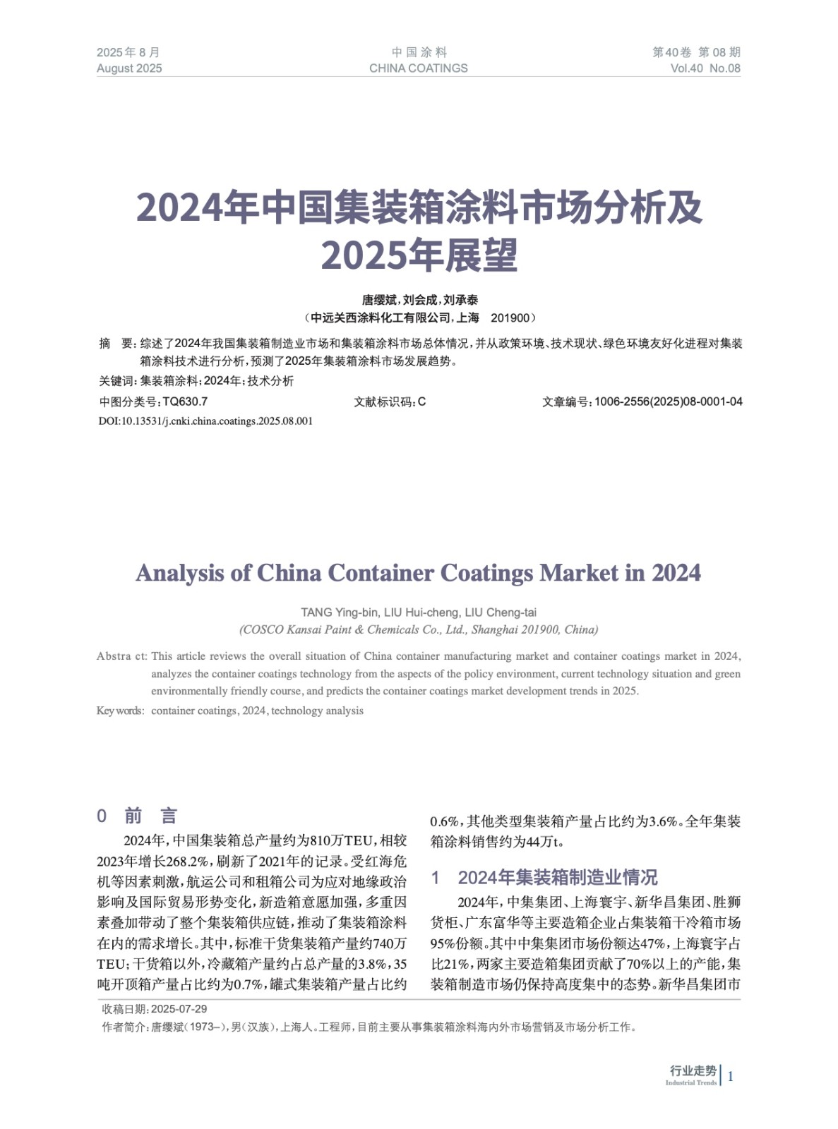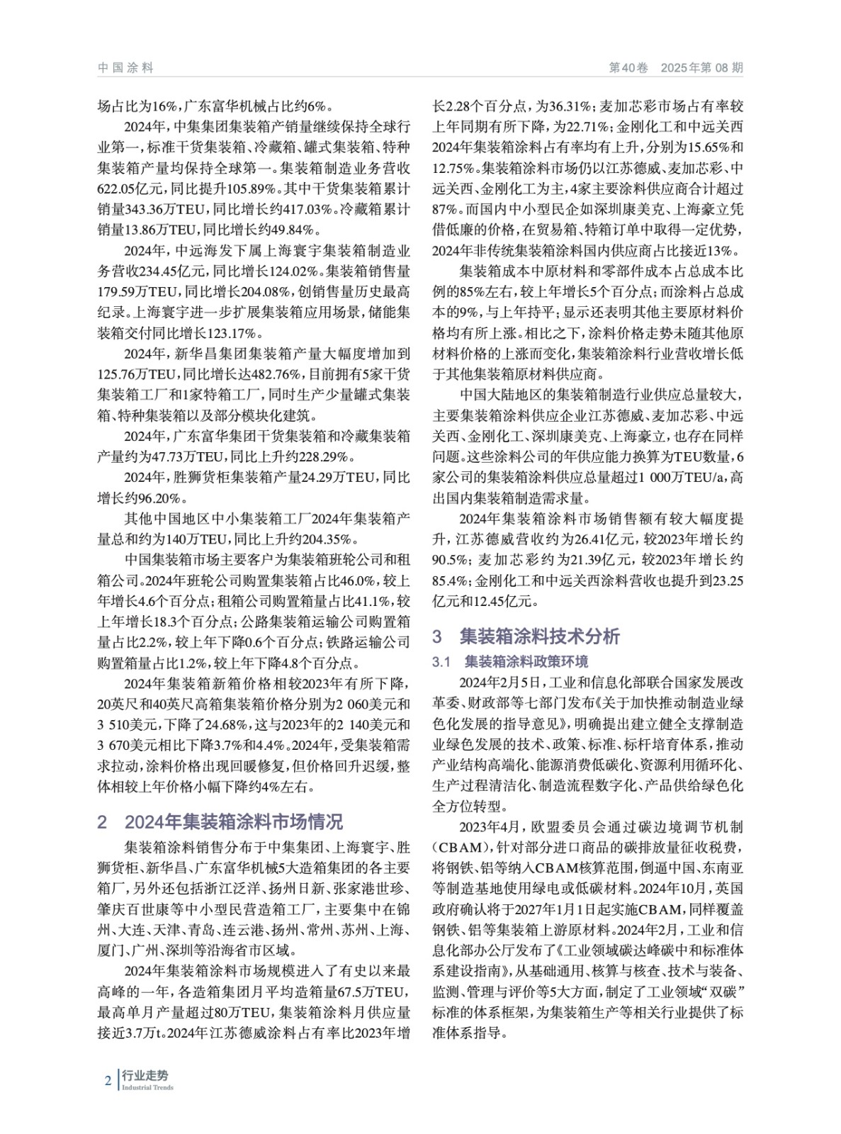 綜述了2024年我國集裝箱制造業市場和集裝箱涂料市場總體情況,并從政策環境、技術現狀、綠色環境友好化進程對集裝箱涂料技術進行分析,預測了2025年集裝箱涂料市場發展趨勢。