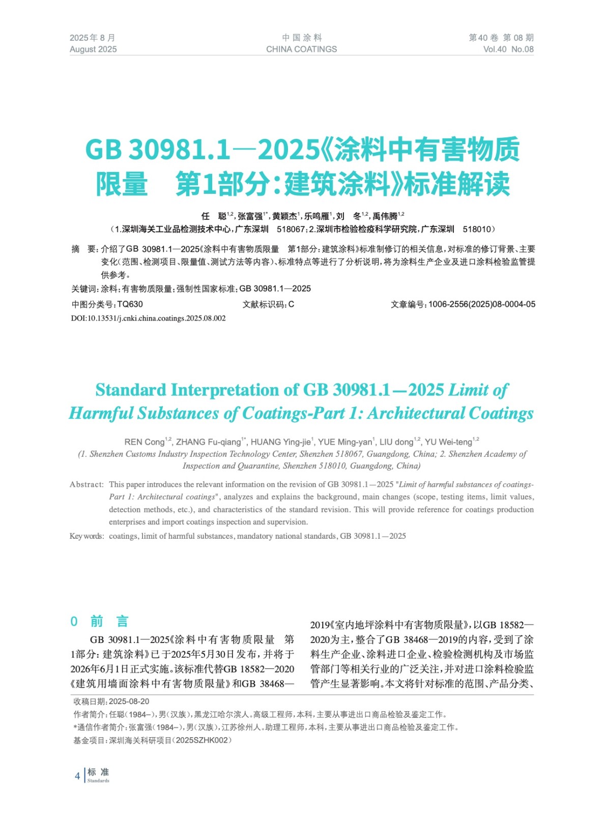 摘要:介紹了GB 30981.1—2025《涂料中有害物質(zhì)限量 第1部分:建筑涂料》標(biāo)準(zhǔn)制修訂的相關(guān)信息,對標(biāo)準(zhǔn)的修訂背景、主要變化(范圍、檢測項目、限量值、測試方法等內(nèi)容)、標(biāo)準(zhǔn)特點等進行了分析說明,將為涂料生產(chǎn)企業(yè)及進口涂料檢驗監(jiān)管提供參考。