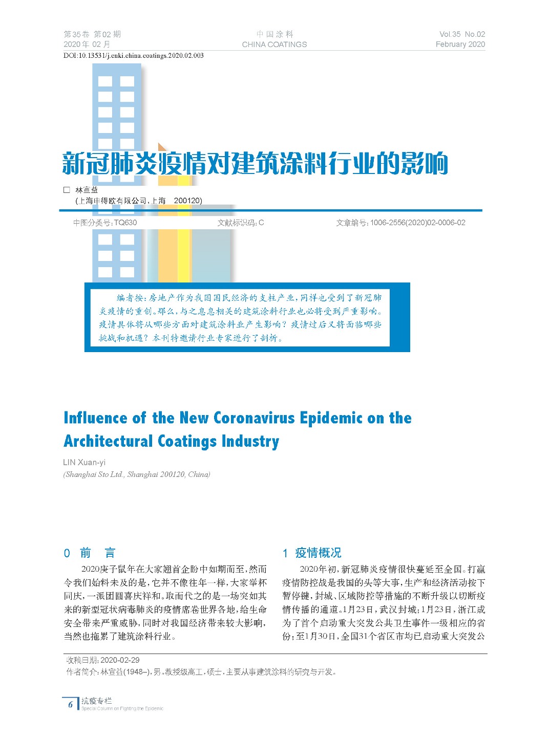 摘要:編者按:房地產(chǎn)作為我國國民經(jīng)濟的支柱產(chǎn)業(yè),同樣也受到了新冠肺炎疫情的重創(chuàng)。那么,與之息息相關(guān)的建筑涂料行業(yè)也必將受到嚴重影響。疫情具體將從哪些方面對建筑涂料業(yè)產(chǎn)生影響?疫情過后又將面臨哪些挑戰(zhàn)和機遇?本刊特邀請行業(yè)專家進行了剖析。