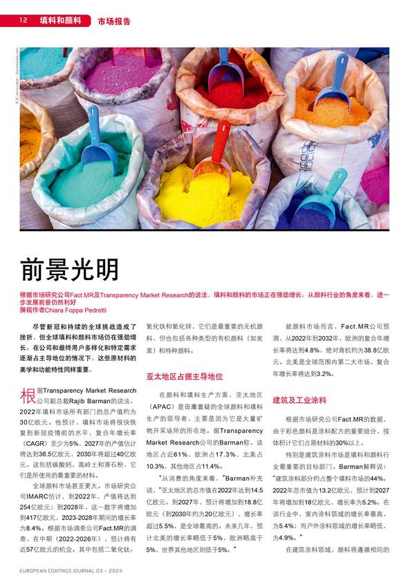 根據(jù)市場(chǎng)研究公司Fact.MR及Transparency Market Research的說(shuō)法,填料和顏料的市場(chǎng)正在強(qiáng)勁增長(zhǎng)。從顏料行 業(yè)的角度來(lái)看,進(jìn)一步發(fā)展前景仍然利好