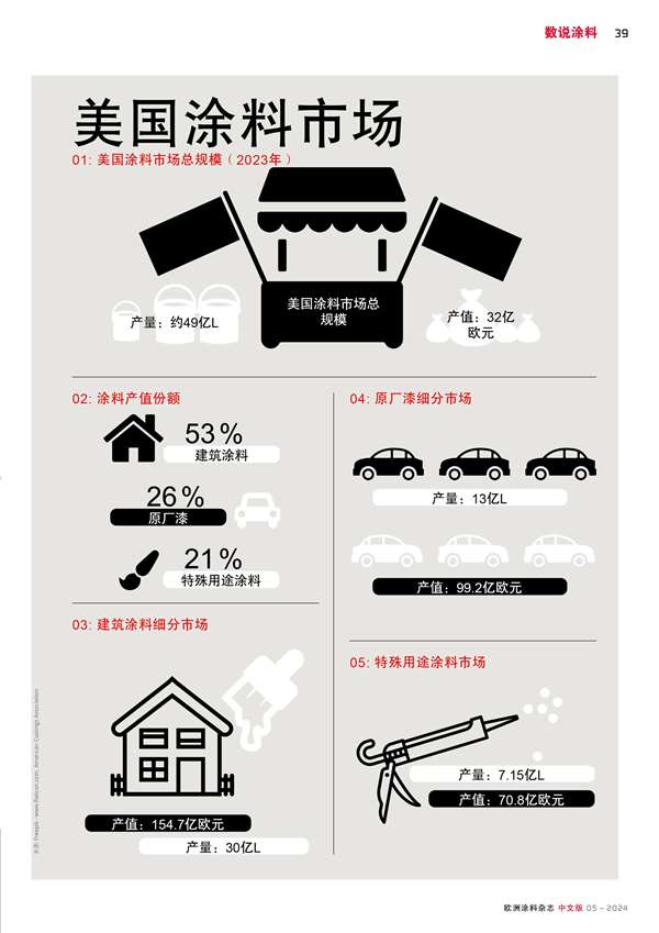 美國涂料市場總規模( 2023年)產量約49億L,產值 32億歐元