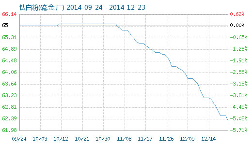 12月23日鈦白粉(硫.金.廠)商品指數為62.17,較昨日下降了0.16點,較周期內最高點100.00點(2011-09-04)下降了37.83%,較2014年04月13日最低點61.70點上漲了0.76%。(注:周期指2011-09-01至今)