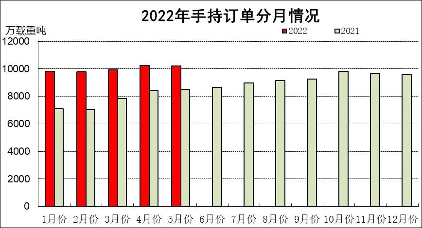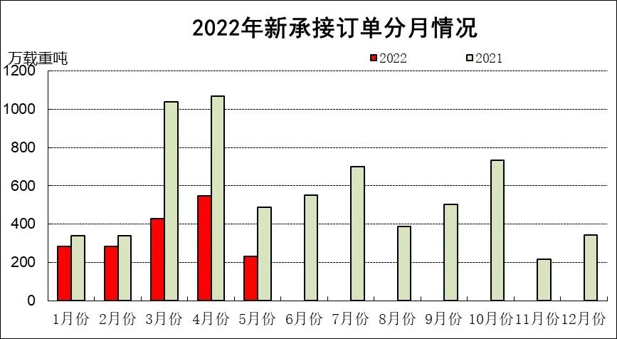 1~5月,50家重點監(jiān)測的造船企業(yè)完工出口船1230萬載重噸,同比下降23.4%;承接出口船訂單1546萬載重噸,同比下降46.4%;5月末手持出口船訂單8981萬載重噸,同比增長21.3%。出口船舶分別占重點造船企業(yè)完工量、新接訂單量、手持訂單量的89.5%、93.7%和90.7%。