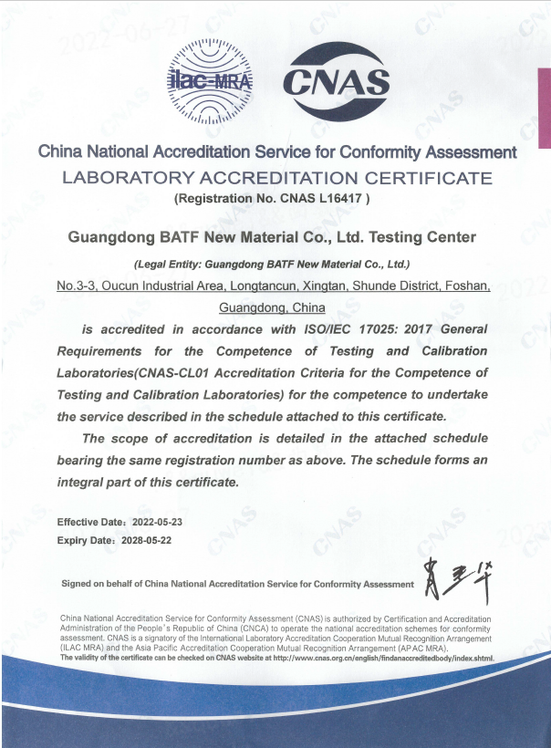 2、產品CNAS認證,必須由具備CNAS認證資質的實驗室承接相關檢測業務,并出具產品檢測報告。巴德富獲得CNAS認證,意味著巴德富出具的產品檢測報告具有權威性、獨立性、公正性、技術性、規范性、統一性、國際性等特征。