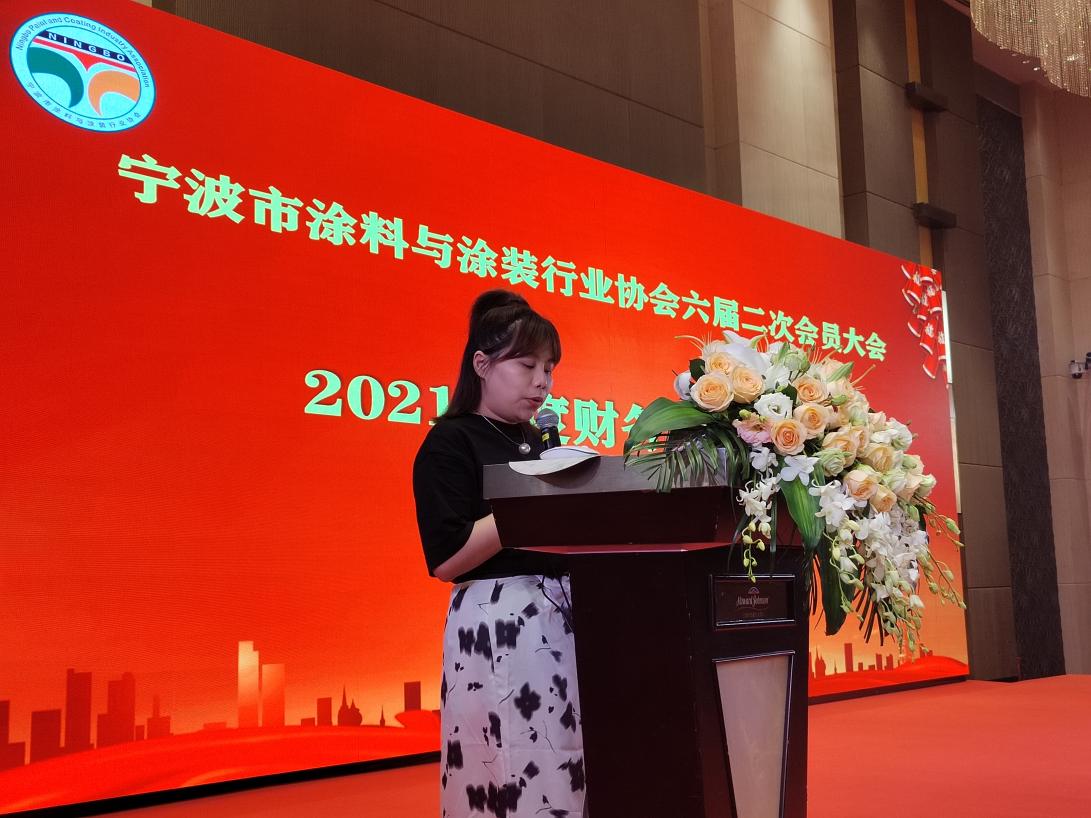 寧波知聯(lián)三江稅務(wù)師事務(wù)所有限公司嚴(yán)珂娜經(jīng)理為大會(huì)作《寧波市涂料與涂裝行業(yè)協(xié)會(huì)2021年度財(cái)務(wù)收支報(bào)告》。