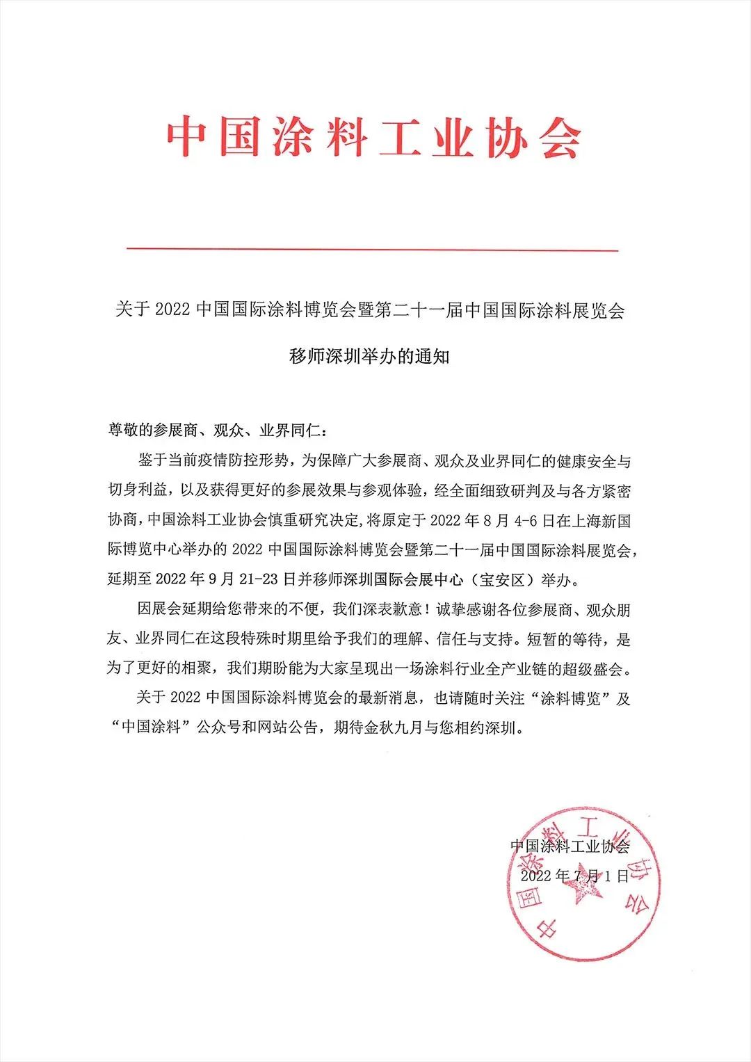 7月1日,中國涂料工業協會正式官宣,將原定于2022年8月4-6日在上海新國際博覽中心舉辦的2022中國國際涂料博覽會暨第二十一屆中國國際涂料展覽會,移師深圳國際會展中心(寶安區)舉辦。