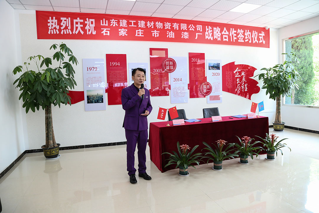 石家莊市油漆廠董事長焦亞平、山東建工建材物資有限公司董事長任俊生,代表雙方簽約。標志著雙方合作正式邁出了關(guān)鍵一步。