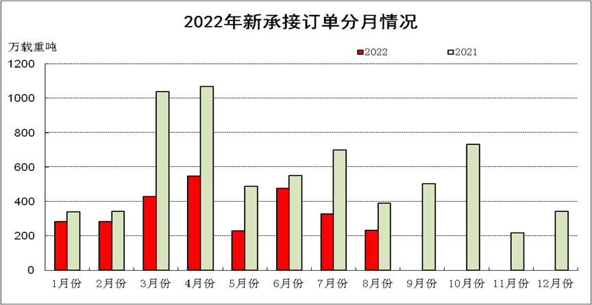 1~8月,50家重點監測造船企業造船完工2291萬載重噸,同比下降10.8%。承接新船訂單2632萬載重噸,同比下降44.9%。8月底,手持船舶訂單9878萬載重噸,同比增長10.1%。