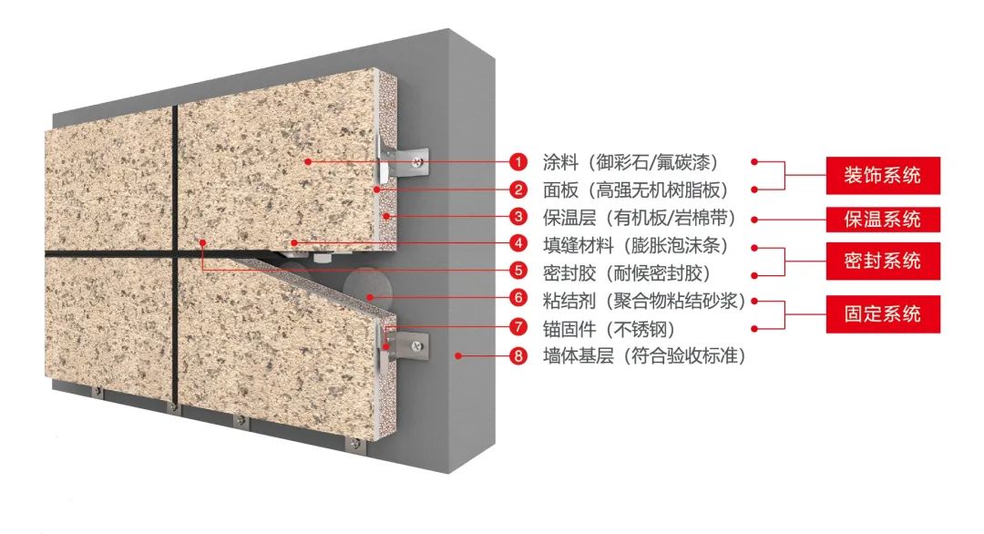 亞士創能保溫裝飾成品板自重輕,每平方米單位質量不超過30 kg,而30 mm厚的石材每平方米質量在75-100 kg,只有石材的1/10到2/5,安全性大大提升。