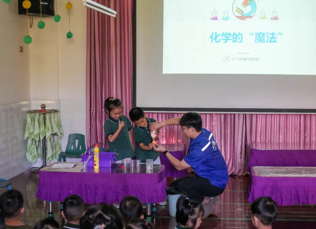 志愿者們首先向小朋友展示了“紅綠燈”、“火山噴發”、“彩虹”等化學、物理小實驗,通過新奇多彩的實驗現象,激起了孩子們濃濃的求知欲和好奇心。志愿者們將科學知識與充滿想象力的“童言童語”相融合,為孩子們上了一節生動的科學課。
