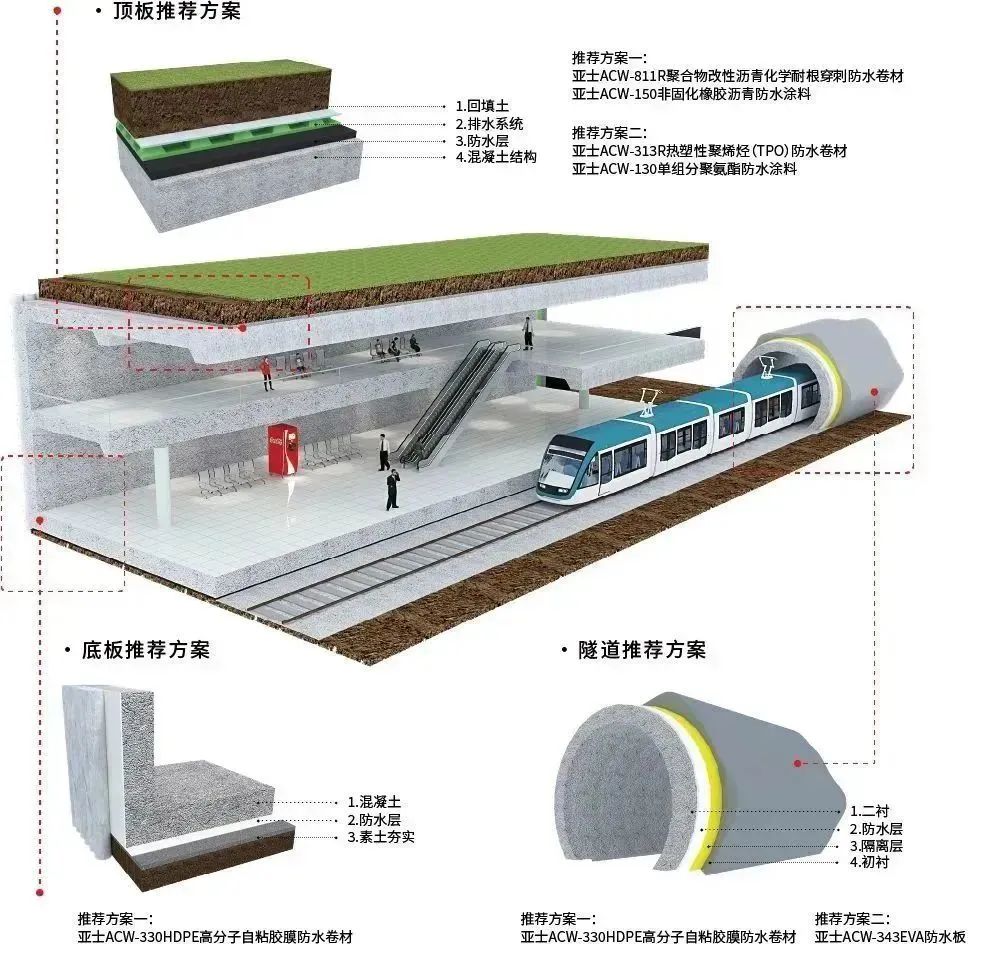 亞士防水針對(duì)不同結(jié)構(gòu)形式提供不同的系統(tǒng)解決方案,選擇易于施工、安全環(huán)保、符合氣候條件的防水材料,以混凝土結(jié)構(gòu)自防水為基礎(chǔ),以整體外包防水層為輔助,以變形縫、施工縫等接縫防水為處理重點(diǎn),達(dá)成“剛?cè)嵯酀?jì)、多道防線”的綜合治理體系,解決軌道交通工程在建設(shè)、運(yùn)營(yíng)各環(huán)節(jié)中存在的滲漏問(wèn)題,助力“百年工程”防水無(wú)漏,質(zhì)量無(wú)憂。
