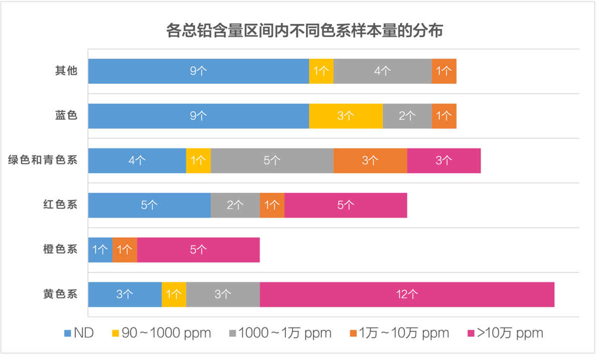 圖5 不同色系涂料樣本在各總鉛含量區間值內的數量分布