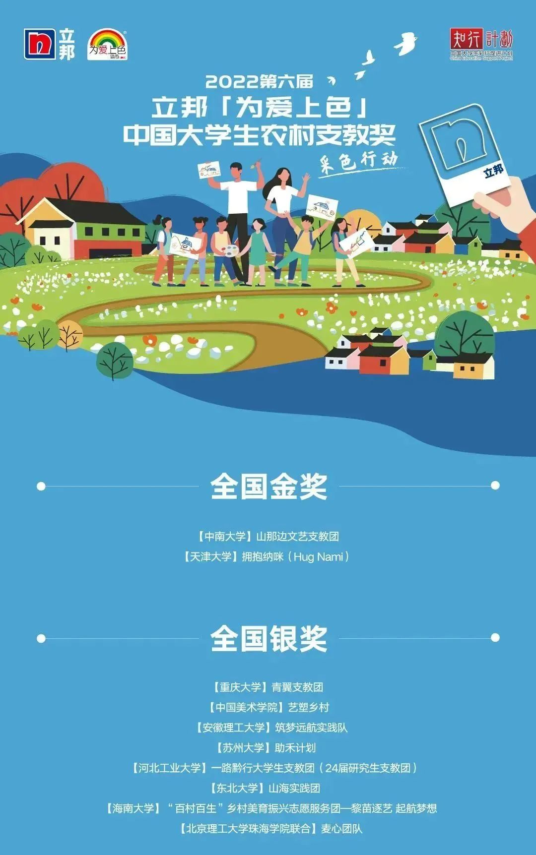 2022年第六屆立邦「為愛(ài)上色」中國(guó)大學(xué)生農(nóng)村支教獎(jiǎng)獲獎(jiǎng)名單