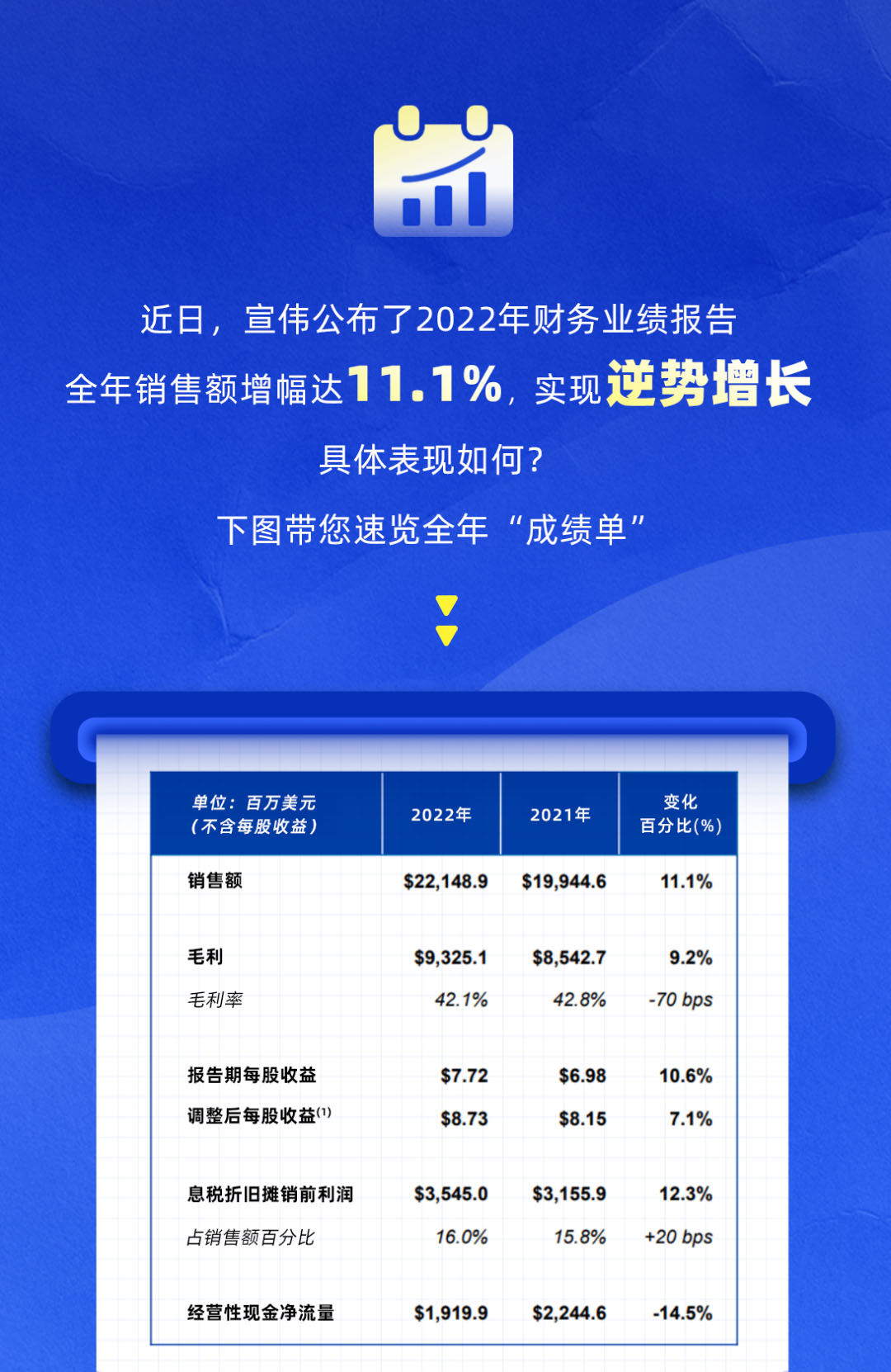 近日,宣偉公布了2022年財務業績報告全年銷售額增幅達11.1%,實現逆勢增長具體表現如何?本文帶您速覽其全年“成績單"。