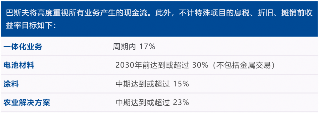 2024年1月起,巴斯夫?qū)⒉捎眯碌年P(guān)鍵績(jī)效指標(biāo)(KPI)指導(dǎo)整個(gè)集團(tuán)。短中期內(nèi),公司會(huì)更重視不計(jì)特殊項(xiàng)目的息稅、折舊、攤銷前收益和現(xiàn)金流。同時(shí),公司將繼續(xù)把已動(dòng)用資本回報(bào)率(ROCE)作為中期管理關(guān)鍵績(jī)效指標(biāo),持續(xù)關(guān)注資產(chǎn)盈利能力。