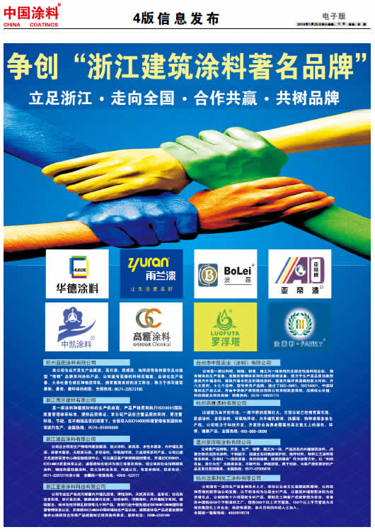 《中國涂料報》(電子版)的一切內容(包括但不限于文字、圖片、PDF、圖表、標志、標識、商標、版面設計、專欄目錄與名稱、內容分類標準以及為讀者提供的任何信息)僅供中國涂料信息網讀者閱讀、學習研究使用,未經中國涂料雜志社有限公司及/或相關權利人書面授權,任何單位及個人不得將《中國涂料報》(電子版)所登載、發布的內容用于商業性目的,包括但不限于轉載、復制、發行、制作光盤、數據庫、觸摸展示等行為方式,或將之在非本站所屬的服務器上作鏡像。否則,中國涂料雜志社有限公司將采取包括但不限于網上公示、向有關部門舉報、訴訟等一切合法手段,追究侵權者的法律責任。