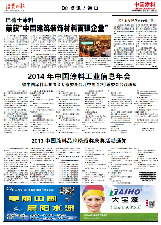 《中國涂料報》(電子版)的一切內容(包括但不限于文字、圖片、PDF、圖表、標志、標識、商標、版面設計、專欄目錄與名稱、內容分類標準以及為讀者提供的任何信息)僅供中國涂料信息網讀者閱讀、學習研究使用,未經中國涂料雜志社有限公司及/或相關權利人書面授權,任何單位及個人不得將《中國涂料報》(電子版)所登載、發布的內容用于商業性目的,包括但不限于轉載、復制、發行、制作光盤、數據庫、觸摸展示等行為方式,或將之在非本站所屬的服務器上作鏡像。否則,中國涂料雜志社有限公司將采取包括但不限于網上公示、向有關部門舉報、訴訟等一切合法手段,追究侵權者的法律責任。