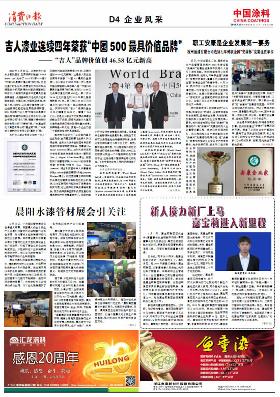 吉人漆業連續四年榮獲“中國500最具價值品牌”