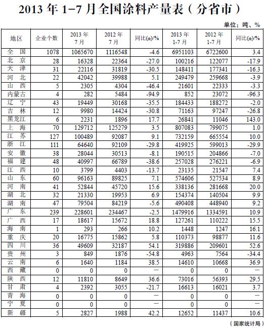 2013 年1-7 月全國(guó)涂料產(chǎn)量表(分省市)